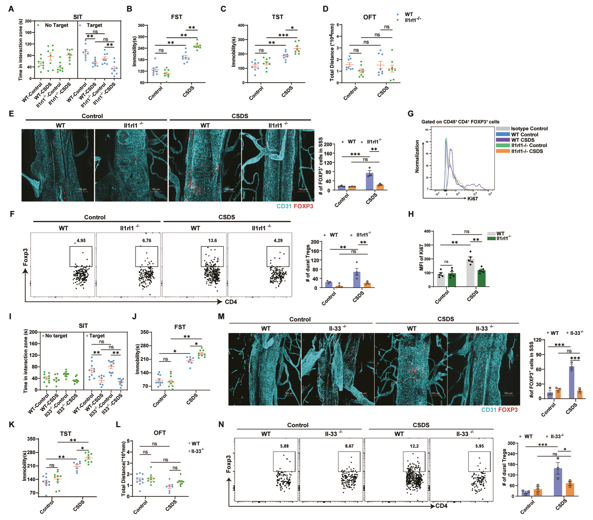 SMART-seq數(shù)據(jù)顯示CSDS小鼠硬腦膜“IL33結(jié)合”以及其他內(nèi)源性分子結(jié)合信號通路表達(dá)上調(diào);與脾臟相比,CSDS小鼠硬腦膜中表達(dá)ST2的細(xì)胞比例顯著高于脾臟;硬腦膜Treg富集趨化性通路。scRNA-seq數(shù)據(jù)也顯示CSDS小鼠模型中T淋巴細(xì)胞聚群高表達(dá)ST2編碼基因,且表達(dá)水平高于對照組小鼠的T淋巴細(xì)胞;CSDS小鼠模型硬腦膜Treg高表達(dá)ST2編碼基因。隨后,研究者將WT小鼠和Il1rl1-/-小鼠硬腦膜Treg細(xì)胞轉(zhuǎn)移到Rag1-/-小鼠并構(gòu)建CSDS模型,行為學(xué)等實(shí)驗(yàn)結(jié)果證實(shí),ST2表達(dá)是硬腦膜Treg招募和擴(kuò)張所必須的。IL33-/-小鼠相關(guān)實(shí)驗(yàn)也支持了IL33/ST2信號在抑郁期間促進(jìn)硬腦膜Treg增殖。