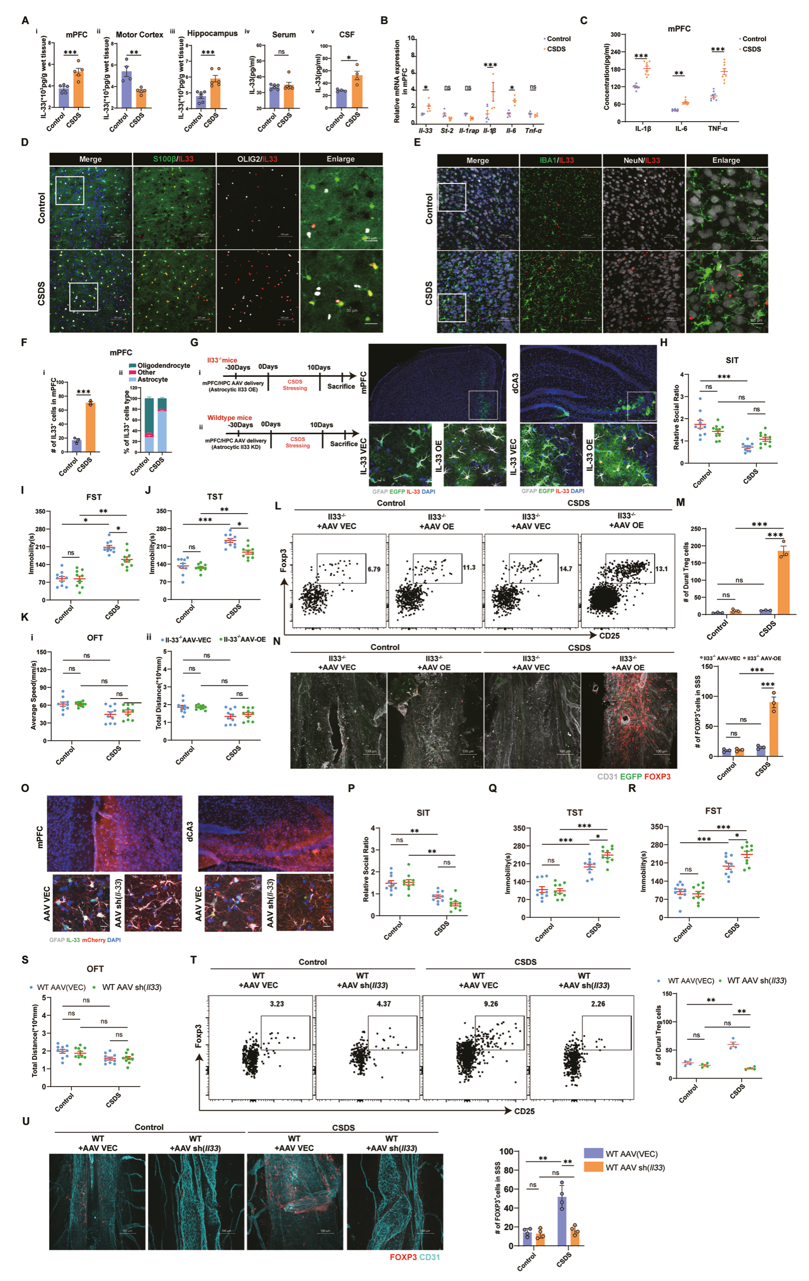 mPFC、海馬、腦脊液等組織的ELISA、qPCR以及Western blot實(shí)驗(yàn)結(jié)果表明,CSDS小鼠硬腦膜ST2+ Treg激活所需的IL33來源于腦實(shí)質(zhì)而不是硬腦膜。多重免疫熒光結(jié)果表明mPFC處星形細(xì)胞是IL33增加的主要貢獻(xiàn)細(xì)胞類型。進(jìn)一步的特異性細(xì)胞類型IL33基因表達(dá)KO-恢復(fù)實(shí)驗(yàn)及相應(yīng)的行為學(xué)實(shí)驗(yàn)、流式細(xì)胞術(shù)等結(jié)果表明,主要是星形細(xì)胞來源的IL33介導(dǎo)了CSDS小鼠中硬腦膜Treg的產(chǎn)生。