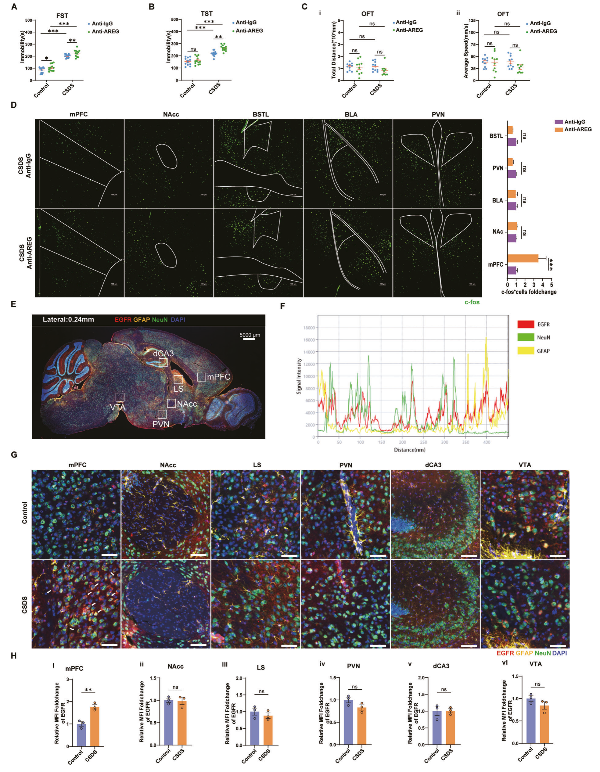 腦免疫熒光掃描結(jié)果表明硬腦膜來源的AREG可能特異性的影響mPFC神經(jīng)元活性,TSA多重染色等實(shí)驗(yàn)結(jié)果表明,CSDS應(yīng)激顯著誘導(dǎo)mPFC神經(jīng)元EGFR(AREG是EGFR配體)的表達(dá),硬腦膜AREG去除可顯著抑制mPFC的EGFR激活,小腦延髓池注射的AREG中和抗體只去除了硬腦膜AREG但對mPFC腦區(qū)AREG無顯著影響。通過這些結(jié)果,研究者假設(shè)神經(jīng)元表達(dá)EGFR可以接收硬腦膜Treg來源的AREG,并激活EGFR信號,直接影響神經(jīng)元活性。