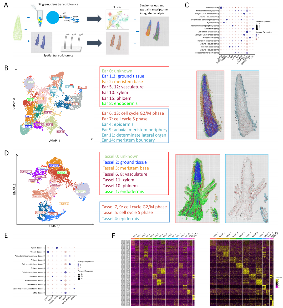 圖5-基于空間轉(zhuǎn)錄組學(xué)和標(biāo)記基因的玉米雌穗和雄穗的細(xì)胞聚類與細(xì)胞類型鑒定
