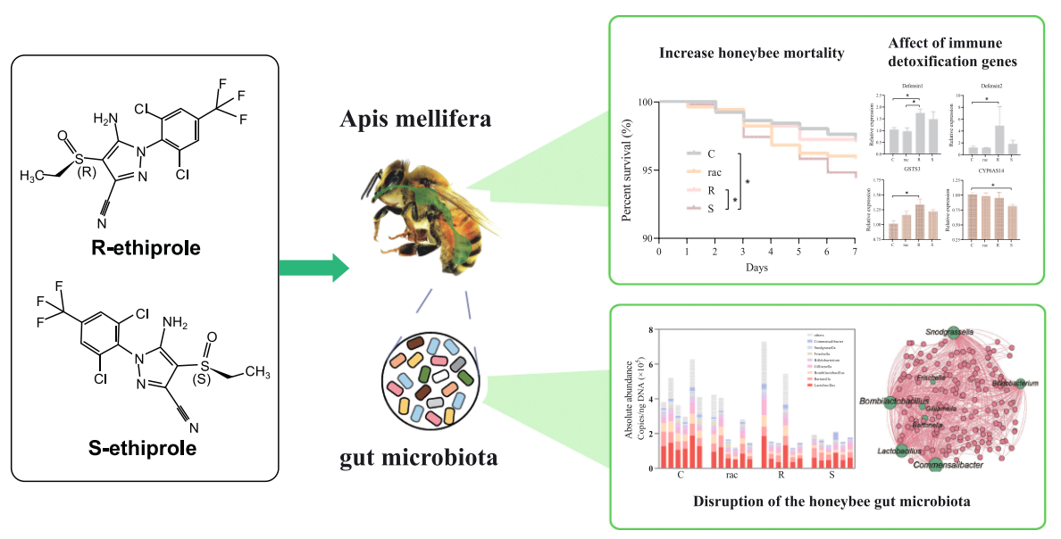 蜜蜂是重要的傳粉者,在覓食過程中容易受到外部病原體和農(nóng)藥的影響。手性乙蟲腈作為一種重要的農(nóng)藥,廣泛用于農(nóng)業(yè)生產(chǎn),但其對蜜蜂的副作用尚不清楚。該研究分析了三種形式的乙蟲腈(rac-乙蟲腈、R-乙蟲腈和S-乙蟲腈)對蜜蜂及其腸道微生物的毒性。結(jié)果表明,乙蟲腈對映體對傳粉者具有潛在的毒性,并為農(nóng)業(yè)中農(nóng)藥的安全合理使用提供了依據(jù)。