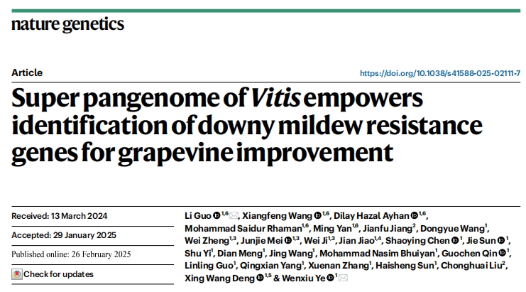 2025年02月26日,濰坊現(xiàn)代農(nóng)業(yè)山東省實驗室、北京大學現(xiàn)代農(nóng)業(yè)研究院葉文秀研究員和郭立研究員團隊在國際期刊《自然-遺傳學(Nature Genetics)》上在線發(fā)表了題為Super pangenome of Vitis?empowers identification of downy mildew resistance genes for grapevine improvement的研究成果作為葡萄科研領域里程碑式的重大突破,繪制了涵蓋葡萄屬的歐亞、北美和東亞世界三大種群的72個葡萄種質(zhì)材料的單倍型超級泛基因組圖譜,揭示葡萄屬豐富遺傳多樣性和雜交歷史,基于葡萄多組學數(shù)據(jù),挖掘到葡萄霜霉病抗性相關遺傳變異和抗病基因,加速葡萄精準分子育種,開啟葡萄種質(zhì)創(chuàng)新和利用新時代。百邁客生物為該研究提供了基因組、hic、轉(zhuǎn)錄組等測序服務。