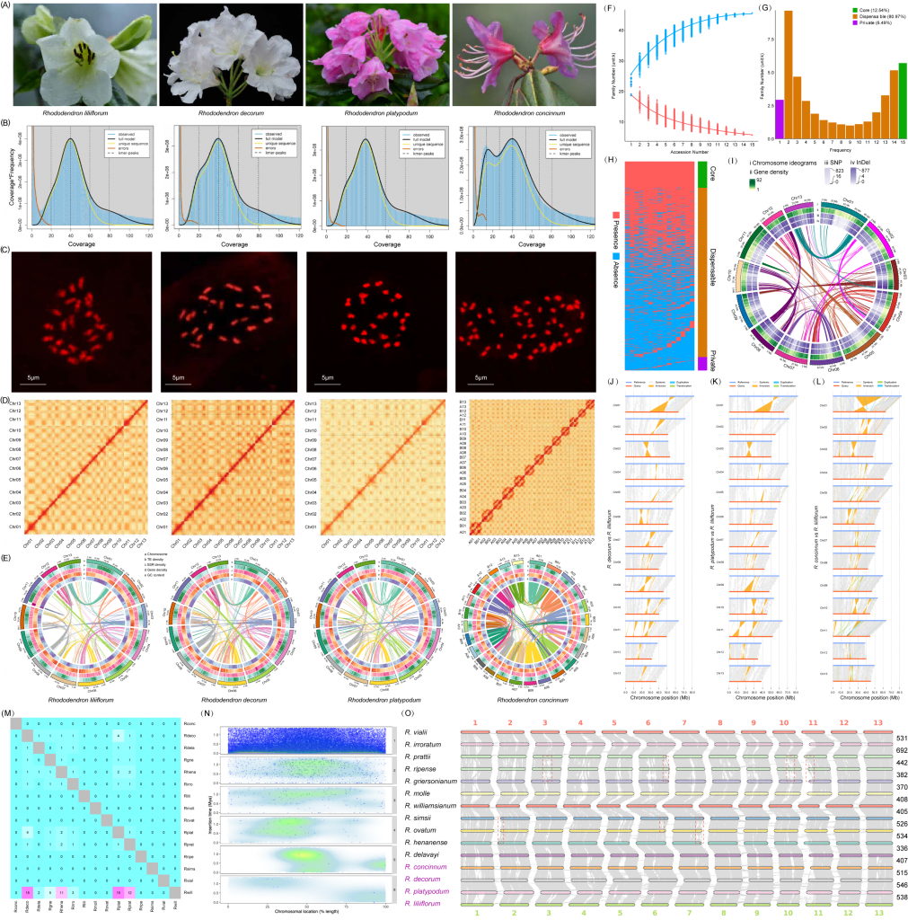 圖 1. 4種杜鵑屬及11種已發(fā)表杜鵑屬植物的基因組分析 (A)四種杜鵑花的開花照片;(B)通過k-mer進(jìn)行基因組調(diào)查。(C)流式細(xì)胞術(shù)檢測染色體核型;(D)基因組組裝的Hi-C接觸圖;(E)轉(zhuǎn)座子、SSR、基因密度和GC含量在染色體上的分布;(F)核心(紅色)和非核心(藍(lán)色)基因家族數(shù)量趨勢圖;(G)核心集群、可有可無集群和私有集群的家族數(shù)量;(H)核心、可有可無和私有集群的存在和缺失分析;(I)百合杜鵑花基因組中基因密度、SNP和InDel變異的分布情況;(J-L)以T2T基因組為參照,研究了端粒紅豆杉、鴨嘴獸和短柄紅豆杉基因組的同源性和重排;(M)兩個物種之間共享LTR的比例(Rconc:?R. concinnum; Rdeco:?R. decorum; Rdela:?R. delavayi; Rgrie:?R. griersonianum; Rhena:?R. henanense; Rirro:?R. irroratum; Rlili:?R. liliiflorum; Rmoll:?R. molle; Rovat:?R. ovatum; Rplat:?R. platypodum; Rprat:?R. prattii; Rripe:?R. ripense; Rsims:?R. simsii; Rvial:?R. vialii; Rwill:?R. williamsianum);(N)LTR在染色體上的分布。x軸代表染色體位置的百分比,y軸代表LTR的插入時間;(O)15種杜鵑屬植物的基因組共線性。右邊的數(shù)字表示共線塊編號。