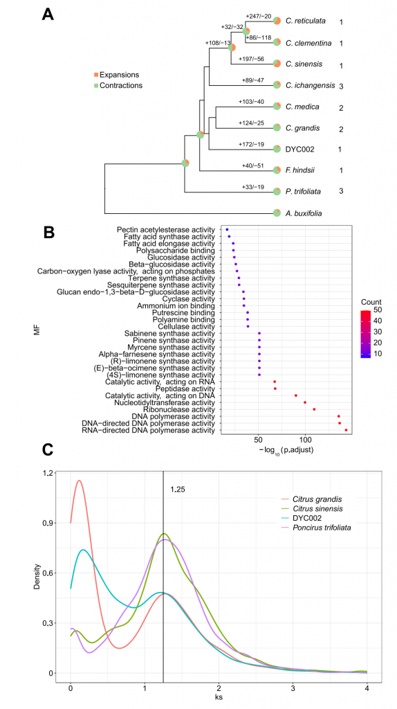 作者利用53.7G PacBio HiFi、22.6G illumina reads和40.1G Hi-Creads,首先組裝出318.71 Mbp大小的contig版本基因組,contig N50為2.48 M,接著利用HIC數(shù)據(jù)將contig 掛載到染色體上,得到得到294 Mbp的基因組,BUSCO評估完整性大于98%,LTR組裝指數(shù)(LAI)得分高達21.1,測序數(shù)據(jù)回比率為97.43%,進一步支持了組裝的完整性。最后對DYC002基因組注釋,共注釋到34,652個蛋白編碼基因和215,693個重復(fù)序列。重復(fù)序列多為LTR,尤其是Gypsy LTR和Copia LTR,占組裝基因組的23.62%。比較基因組發(fā)現(xiàn)DYC002有191個基因家族正在快速進化。GO富集分析表明,這些快速進化的基因主要富集于萜烯合酶活性、倍半萜合酶活性、(4S)-檸檬烯合酶活性、(E)-檸檬烯合酶活性、葡萄糖苷酶活性和-葡萄糖苷酶活性等功能,表明DYC002在進化過程中香氣和風味發(fā)生了顯著變化。