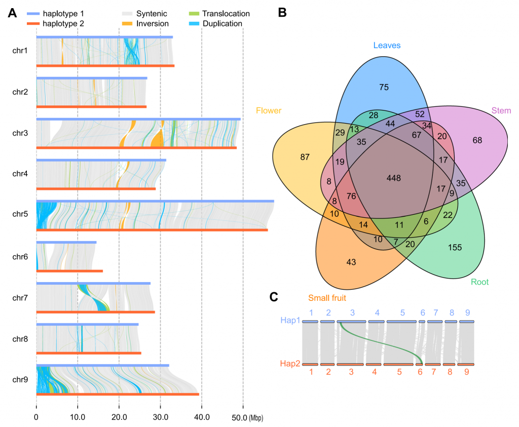 利用CCS數(shù)據(jù)和HIC數(shù)據(jù),作者組裝出DYC002的兩套單倍型基因組,長度分別為294和300 Mbp,注釋的基因數(shù)量分別為28000和27785個;BUSCO完整度分別為97.39%和97.33%。通過比較分析,兩單倍型基因組間存在175萬個SNPs,303,686個Indels,轉(zhuǎn)錄組分析表明,兩個單倍型中等位基因的表達高度一致。葉片中等位基因特異性表達基因(ASEGs)數(shù)量最高,而花中數(shù)量最低。在單倍型1和單倍型2的組裝中分別發(fā)現(xiàn)了535個和499個單倍型特異性基因。