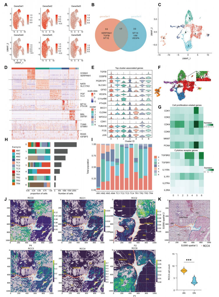 進一步分析,發(fā)現(xiàn)ccRCC亞群0~4簇與不同基因集表達譜匹配,5和6簇不與任何基因集匹配但具有細胞周期和應激響應相關(guān)基因表達。RCC0簇和RCC2簇代表EMThigh腫瘤細胞并在IF區(qū)域富集,RCC1簇代表PT(近曲小管)細胞,擬時序分析結(jié)果顯示存在RCC0—>RCC2分化關(guān)系,但RCC2幾乎只在P2患者樣本中發(fā)現(xiàn),表明RCC2可能與個別患者特征相關(guān)。RCC1、RCC3和RCC4細胞主要在組織而不是腫瘤區(qū)域富集,RCC4主要分布在AN和DN區(qū)域,RCC4在AN區(qū)域分布數(shù)量高于DN區(qū)域。RCC4高表達細胞因子受體基因,表明TME中分泌的促腫瘤細胞因子可能傾向于作用到RCC4,增加其轉(zhuǎn)變成癌細胞的概率,加速腫瘤逃逸,促進腫瘤惡性化,與以往瘤旁附近不是完全的健康組織認識相符合。