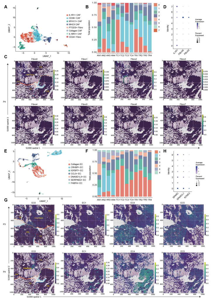 scRNA-seq與空間數(shù)據(jù)均顯示,ccRCC存在8種激活的成纖維細胞簇,腫瘤區(qū)域成纖維細胞數(shù)量高于健康組織,其中CD24+IL32+成纖維細胞顯著富集在腫瘤區(qū)域,PTGDS+成纖維細胞幾乎全分布在AN,高表達ECM(胞外基質(zhì))形成和EMT的成纖維細胞簇在IF較為富集,IL1R1+?CAF(腫瘤相關(guān)成纖維細胞)表現(xiàn)出腫瘤促進表型;7種EC(內(nèi)皮細胞)簇中4種(0,2,3和6)主要富集在腫瘤組織,3種(1,4和5)在健康組織富集,膠原蛋白EC(0簇)豐度最高,具有促腫瘤特征??傊?strong>不同的ECM蛋白質(zhì)產(chǎn)生基質(zhì)細胞傾向于富集在IF并共定位,可能行駛多種功能,包括細胞-細胞交互和胞外組分重構(gòu)。