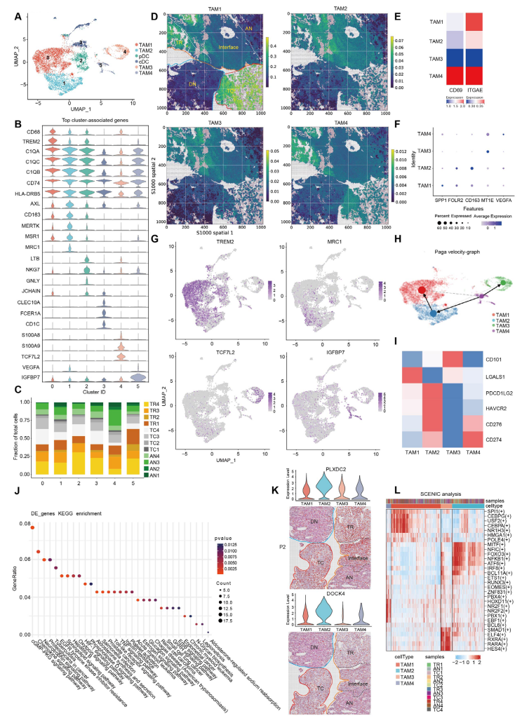 scRNA-seq數(shù)據(jù)與空間數(shù)據(jù)均顯示,4種TAM簇具有不同分布趨勢,TAM1主要分布在TC區(qū)域;TAM2高表達FOLR2、MRC1和CD163,可能是M2樣巨噬細胞且具有增強的免疫抑制特征,TAM4是組織駐留巨噬細胞,兩者主要分布在TR區(qū)域;TAM3表達炎癥響應相關(guān)基因,在TR和AN區(qū)域富集。RNA速率分析顯示存在TAM4—>TAM2—>TAM1和TAM4—>TAM3兩種軌跡,以及從IF區(qū)域遷移到TC區(qū)域的趨勢。進一步的功能分析顯示,IF區(qū)域的TAM2可能通過促進EMT,TC區(qū)域的TAM2可能通過促進腫瘤血管生成,起到促癌效應??傊?,TAM2不同的腫瘤促進效應可能與免疫抑制TME有關(guān)。