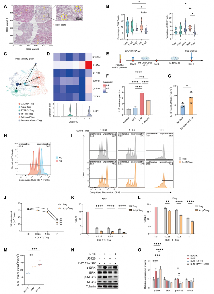 空間轉(zhuǎn)錄組數(shù)據(jù)結(jié)果顯示不同Treg細胞100μm范圍內(nèi)激活的CD4+/CD8+ T細胞數(shù)量較少,終末效應Treg細胞100μm范圍內(nèi)CD4+/CD8+ T細胞數(shù)量更少,表明終末效應Treg細胞周圍應答Treg細胞(Tresp)增殖受到更強的抑制。細胞共培養(yǎng)實驗表明終末效應Treg細胞具有強免疫抑制功能。RNA速率分析結(jié)果表明效應終末Treg可能由初始Treg細胞分化而來,體外實驗表明IL-18可刺激CD4+CD25+ Treg細胞上調(diào)IL-1β表達,表明終末效應Treg細胞產(chǎn)生和作用可能與IL-18有關(guān)。ERK激活劑/NF-κB激活劑促進IL-18+ Treg細胞的產(chǎn)生,IL-18處理后Treg細胞ERK/NF-κB磷酸化水平增加,ERK抑制劑可抑制Treg細胞表達NF-κB但NF-κB抑制劑無法抑制ERK表達,綜上,這些結(jié)果表明IL-18可能通過ERK/NF-κB通路介導終末效應Treg細胞的產(chǎn)生。