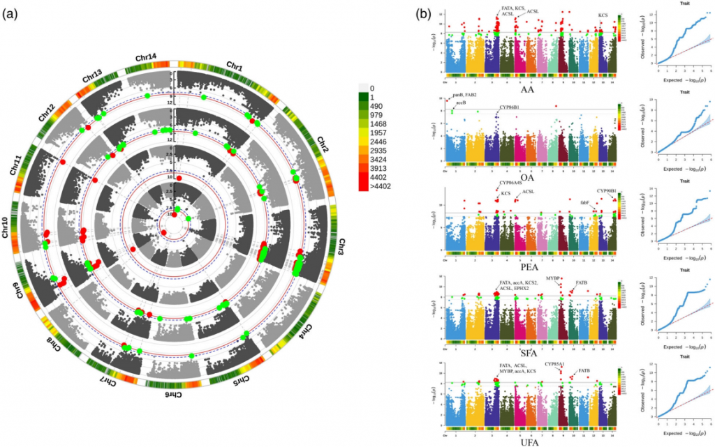 鎖定油脂合成關(guān)鍵位點(diǎn):通過全基因組關(guān)聯(lián)分析(GWAS),團(tuán)隊(duì)識別出影響種仁油脂組成的多個(gè)關(guān)鍵基因(如ACSL、FAD2、FAB2等),為高品質(zhì)油料品種的選育提供了精準(zhǔn)靶點(diǎn)。
