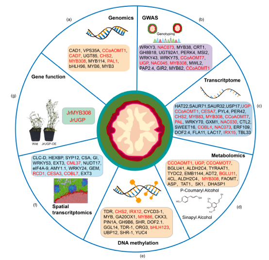通過對十一個(gè)發(fā)育階段的轉(zhuǎn)錄組學(xué)、代謝組學(xué)、DNA甲基化和空間轉(zhuǎn)錄組學(xué)等多組學(xué)分析,揭示了多個(gè)與次生細(xì)胞生物合成和木質(zhì)素積累相關(guān)的候選基因,例如UGP、MYB308、MYB83、NAC043、NAC073、CCoAOMT1、CCoAOMT7、CHS2、CESA7、LAC7、COBL4和IRX12。在擬南芥(Arabidopsis thaliana)中過表達(dá)JrUGPJrMYB308驗(yàn)證了它們在木質(zhì)素生物合成和細(xì)胞壁加厚中的作用。