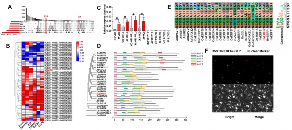 對(duì)3個(gè)耐漬澇材料(Fleet、Tam169、ZW)和3個(gè)漬澇敏感材料(Lian87、Su194、Xiu79)進(jìn)行轉(zhuǎn)錄組測(cè)序(RNA-seq)分析。通過(guò)比較不同材料在正常和漬澇條件下的基因表達(dá)差異,發(fā)現(xiàn)在3個(gè)耐漬澇材料中,位于4H染色體QTL區(qū)間內(nèi)的 HvERF62 基因受漬澇脅迫顯著誘導(dǎo)表達(dá),而在3個(gè)漬澇敏感材料中,該基因表達(dá)量較低(圖3B, 3C)。