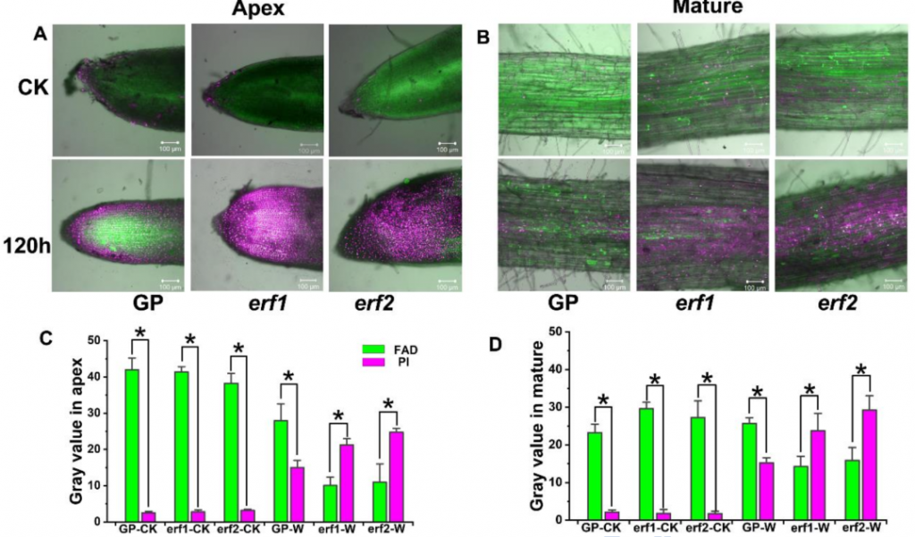 細(xì)胞活力染色實(shí)驗(yàn)表明,在漬澇脅迫下,HvERF62 突變體根部的細(xì)胞死亡程度高于野生型(圖8)。ROS熒光染色實(shí)驗(yàn)表明,在漬澇脅迫下,突變體根部積累了更多的ROS(圖9)。此外,突變體中H2O2含量顯著高于野生型,而CAT和GSH活性顯著低于野生型(圖7A-7C)。