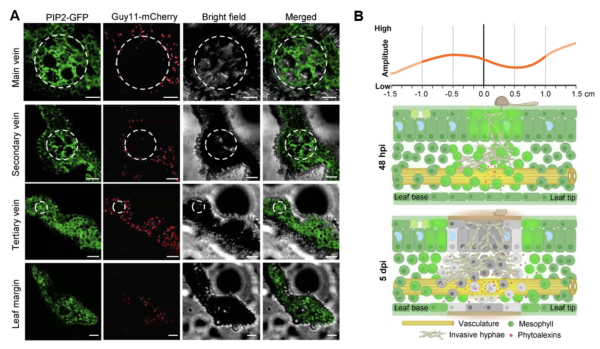 共聚焦顯微鏡觀察結果顯示,稻瘟菌孢子萌發(fā)后優(yōu)先靶向葉脈入侵,但是水稻的維管組織具有較強的免疫,稻瘟菌菌絲無法進一步侵入(圖3A)。時空組測序結果顯示,富含亮氨酸重復序列的(NLR)免疫基因的表達在接種24小時后,葉尖部較葉基部具有更強的積累,表明免疫基因的表達具有極性的特征。綜上所述,該項研究揭示了水稻在稻瘟病菌侵染時免疫基因存在細胞特異性和多維(局部和縱向)的表達模式,為挖掘新的免疫基因提供了重要的數據基礎(圖3B)。