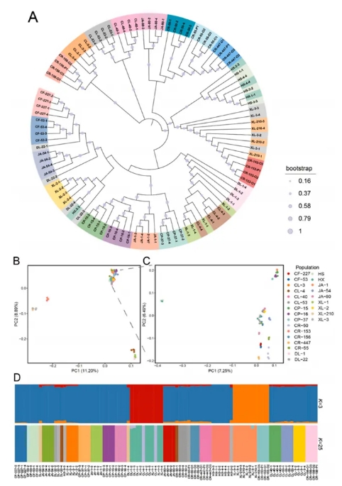 2025年4月2日,Industrial Crops & Products在線發(fā)表了由四川省林草局、四川大學(xué)生命科學(xué)學(xué)院王婧教授課題組聯(lián)合中南林業(yè)科技大學(xué)等多家單位合作完成的研究論文,題為” Phylogenomic analysis and SNP fingerprinting construction of Camellia oleifera Abel. germplasm resources using SLAF-seq technology”。該研究利用SLAF-seq技術(shù),對四川省主栽的來自我國南方25個主要油茶品種開展了系統(tǒng)發(fā)育和群體基因組學(xué)研究,并篩選關(guān)鍵SNP標(biāo)記構(gòu)建了DNA指紋圖譜。該指紋圖譜的構(gòu)建有望為我國南方尤其是四川地區(qū)油茶種質(zhì)資源保護、開發(fā)利用及品種選育提供關(guān)鍵科學(xué)依據(jù)。