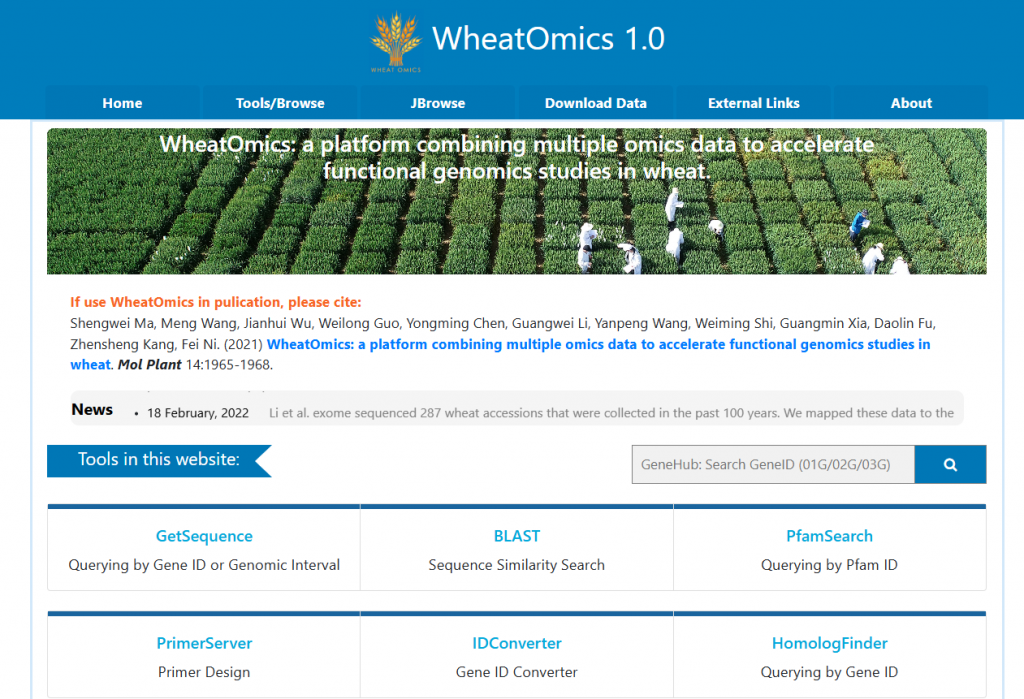 ☆?小麥組學(xué)數(shù)據(jù)在線平臺(tái)WheatOmic:實(shí)現(xiàn)了對(duì)多套麥族物種基因組、轉(zhuǎn)錄組、變異組、突變體庫(kù)外顯子組、表觀修飾組等大數(shù)據(jù)的可視化,并具有擬南芥/水稻-小麥同源基因鑒定、基因共表達(dá)網(wǎng)絡(luò)構(gòu)建、蛋白互作、轉(zhuǎn)錄因子結(jié)合位點(diǎn)分析等多個(gè)分析工具。