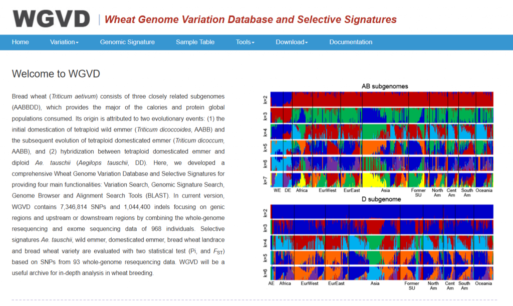 ?小麥基因組變異與選擇信號(hào)數(shù)據(jù)庫(kù)WGVD:匯總了從968個(gè)面包小麥及其祖先中收集到的SNPs、indels,以及基于93個(gè)小麥全基因組重測(cè)數(shù)據(jù)的SNPs評(píng)估的小麥馴化和改良過程中的選擇特征。數(shù)據(jù)庫(kù)主要提供變異、基因組選擇信號(hào)搜索、基因組瀏覽和比對(duì)功能。