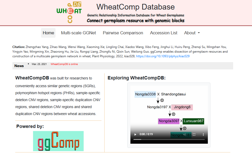 ☆?小麥種質(zhì)資源血緣區(qū)間比較數(shù)據(jù)庫(kù)WheatCompDB:主要針對(duì)數(shù)據(jù)集中任意兩個(gè)樣本間的種質(zhì)資源血緣區(qū)間比較分析,支持基因組水平、染色體水平和局部區(qū)間水平下種質(zhì)資源網(wǎng)絡(luò)的構(gòu)建和挖掘。