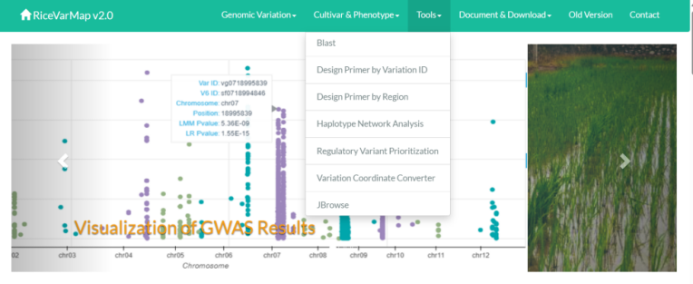 ☆?水稻基因組變異及其功能注釋的綜合數(shù)據(jù)庫(kù)RiceVarMap v2.0:提供了來(lái)自4,726個(gè)水稻種質(zhì)的測(cè)序數(shù)據(jù)中的17,397,026個(gè)基因組變異(包括14,541,446個(gè)SNP和2,855,580個(gè)小?INDEL)的精選信息,高質(zhì)量和完整的基因型數(shù)據(jù),變異的全面注釋,表型數(shù)據(jù)和?GWAS?結(jié)果,對(duì)功能基因定位,標(biāo)記開發(fā)的客戶非常友好。