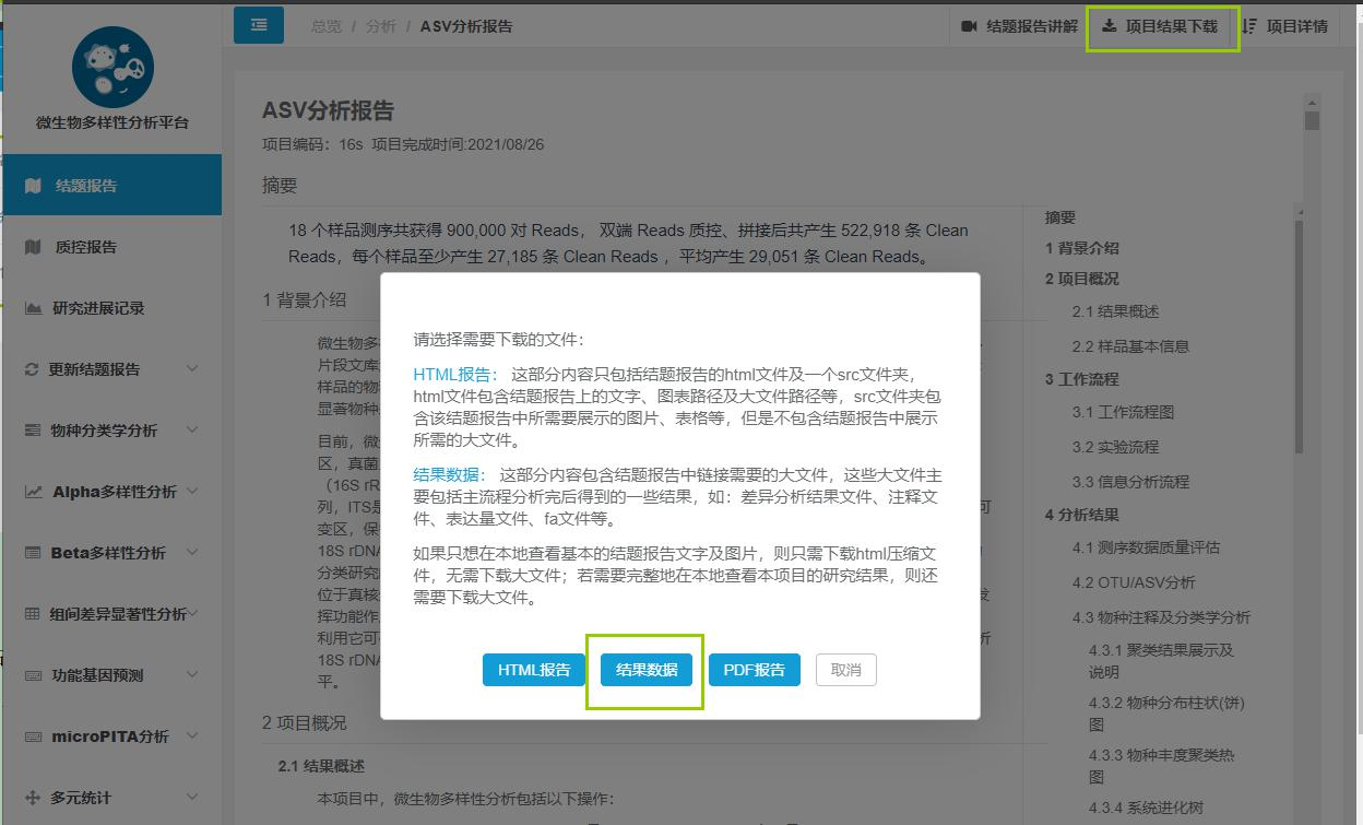 上述報(bào)告查找頁(yè)面 – 打開報(bào)告之后 – 點(diǎn)擊報(bào)告右上角 – 項(xiàng)目結(jié)果下載 – 選擇下載結(jié)果數(shù)據(jù)