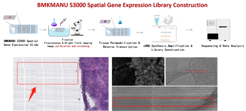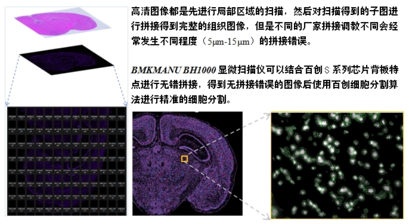 可以利用BH1000對明場及熒光掃描過程中經(jīng)常出現(xiàn)的拼接錯誤進行校準(自主研發(fā)BMCHiper軟件,搭配自研半透半返模塊,實現(xiàn)圖像無錯校準),得到原片無錯高清的熒光圖像與原片無錯高清的明場圖像,為后續(xù)空間數(shù)據(jù)準確的定位和可視化提供基礎(chǔ),使得復雜的轉(zhuǎn)錄組數(shù)據(jù)能夠轉(zhuǎn)化為最直觀,最精準的生物學見解。