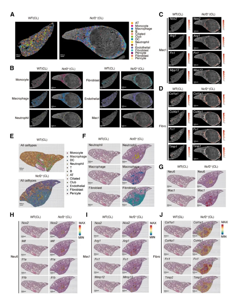 首次通過環(huán)境暴露構(gòu)建自然CGD模型,結(jié)合多組學技術(shù)解析肉芽腫的細胞和分子機制。本研究揭示了CGD肉芽腫中NOS2high中性粒細胞和MMP12+巨噬細胞的協(xié)同作用,并提出MIF和Morrbid作為潛在治療靶點,為CGD的精準干預提供了理論基礎。BMKMANU?S1000空間轉(zhuǎn)錄組通過高分辨率空間定位明確揭示了中性粒細胞(Neu6亞群)在肉芽腫核心、巨噬細胞(Mac1亞群)和成纖維細胞在外圍的分布。在基因表達驗證時確認了NOS2、MIF、IL-1β等基因在肉芽腫不同區(qū)域的差異表達,這一結(jié)果與scRNA-seq結(jié)果高度一致,展示了BMKMANU?S1000在疾病微環(huán)境研究中的高效性。