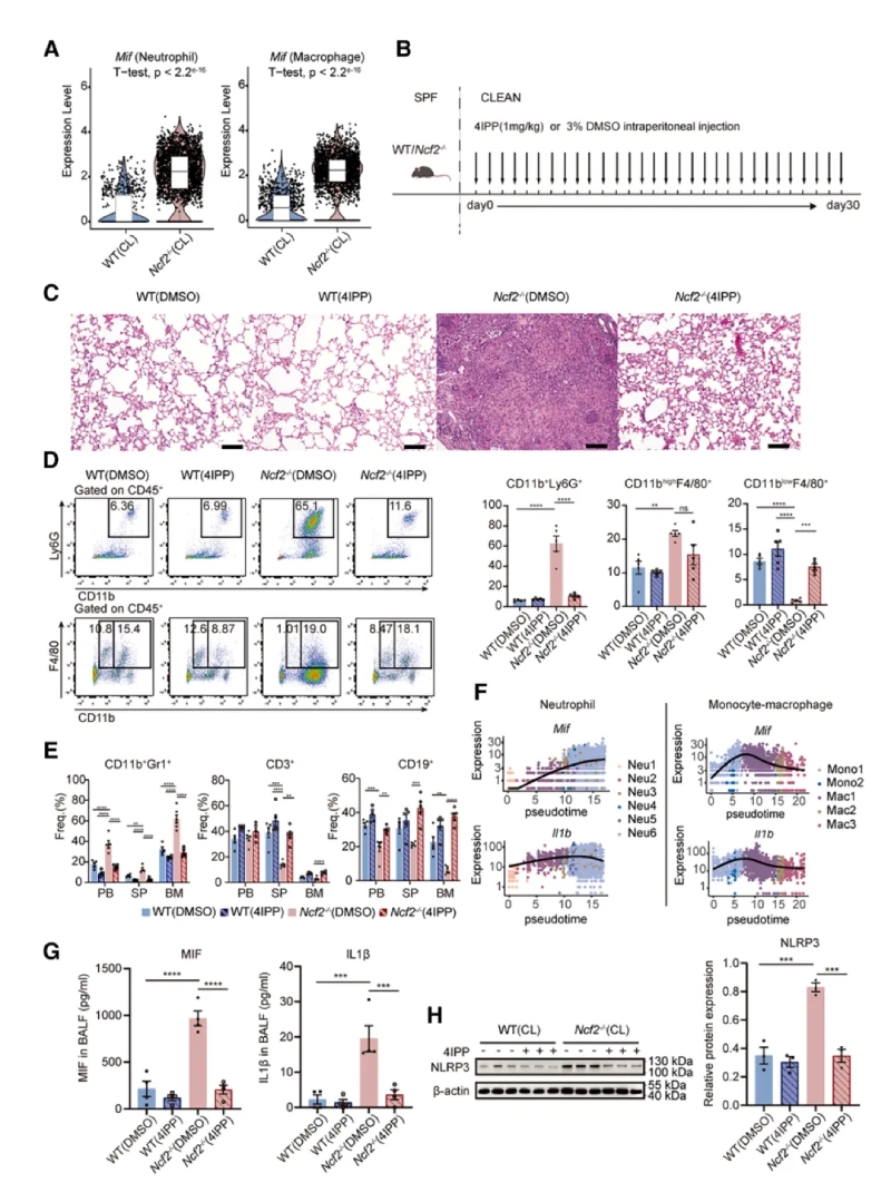 研究顯示,中性粒細胞分為6個亞群,其中Neu6亞群在CL?Ncf2?/?小鼠中顯著擴增且Neu6高表達促炎基因(如Nos2、Mif、Tnf、Il1b)。NO是一種在病原體清除過程中起關鍵作用由NOS2合成的可擴散小分子,CL?Ncf2?/?小鼠肺部的總NO生成量顯著升高。流式驗證顯示CL?Ncf2?/?小鼠肺中NOS2high中性粒細胞比例顯著增加。這些結(jié)果均提示NOS2high中性粒細胞通過產(chǎn)生一氧化氮(NO)和促炎因子,驅(qū)動肉芽腫核心區(qū)的炎癥反應。