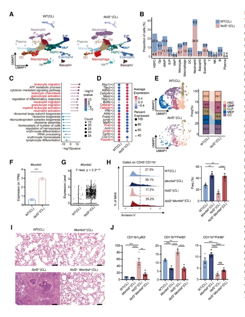 通過單細胞RNA測序和流式細胞術(shù)分析發(fā)現(xiàn)CGD小鼠肺部炎癥微環(huán)境以髓系細胞浸潤為主,提示其參與肉芽腫形成。其中單細胞測序,最終保留了25296個高質(zhì)量細胞樣本,每個細胞平均包含6466條比對讀數(shù)和1972個基因,并識別出9種免疫細胞類型及九種基質(zhì)細胞類型。還發(fā)現(xiàn)一個以細胞周期相關基因(Mki67和Top2a)高表達為特征的細胞簇。通過流式細胞術(shù)分析發(fā)現(xiàn),CL?Ncf2?/?小鼠中CD11b高表達的F4/80+MDMs在比例和絕對數(shù)量上均顯著增加,這些結(jié)果揭示了慢性肉芽腫性葡萄膜炎(CGD)小鼠在肺部感染過程中免疫細胞組成的顯著變化,尤其是中性粒細胞和MDMs的明顯聚集現(xiàn)象。