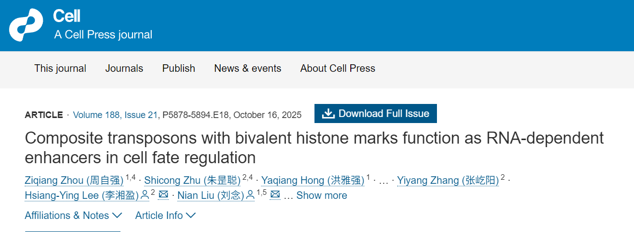近日,清華大學(xué)生命科學(xué)學(xué)院、清華-北大生命科學(xué)聯(lián)合中心劉念課題組聯(lián)合北京大學(xué)生命科學(xué)學(xué)院、北大-清華生命科學(xué)聯(lián)合中心李湘盈課題組在《細(xì)胞》(Cell)雜志上在線發(fā)表了題為“攜帶二價(jià)組蛋白修飾的復(fù)合型轉(zhuǎn)座子作為RNA依賴(lài)性增強(qiáng)子調(diào)控細(xì)胞命運(yùn)”(Composite transposons with bivalent histone marks function as enhancers in cell fate regulation)的研究論文。
