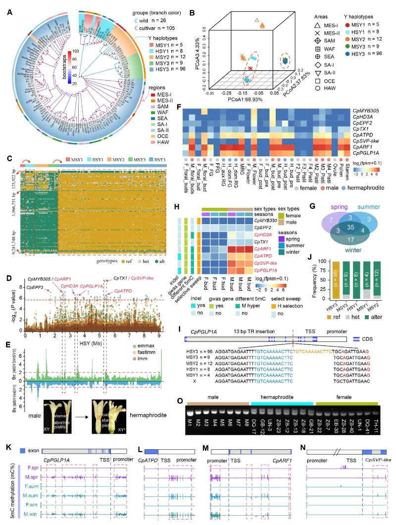 這種性別轉(zhuǎn)換是由針對雄性偏好基因的選擇驅(qū)動的,并在Yh連鎖區(qū)域中定位了一個與性別轉(zhuǎn)換密切相關(guān)13?bp串聯(lián)重復(fù)結(jié)構(gòu)變異(HSY3-TR-13bp)。該兩性株特異性變異位于雄性偏好基因CpPGLP1A中,且被HSY3群體選擇固定(圖3)。