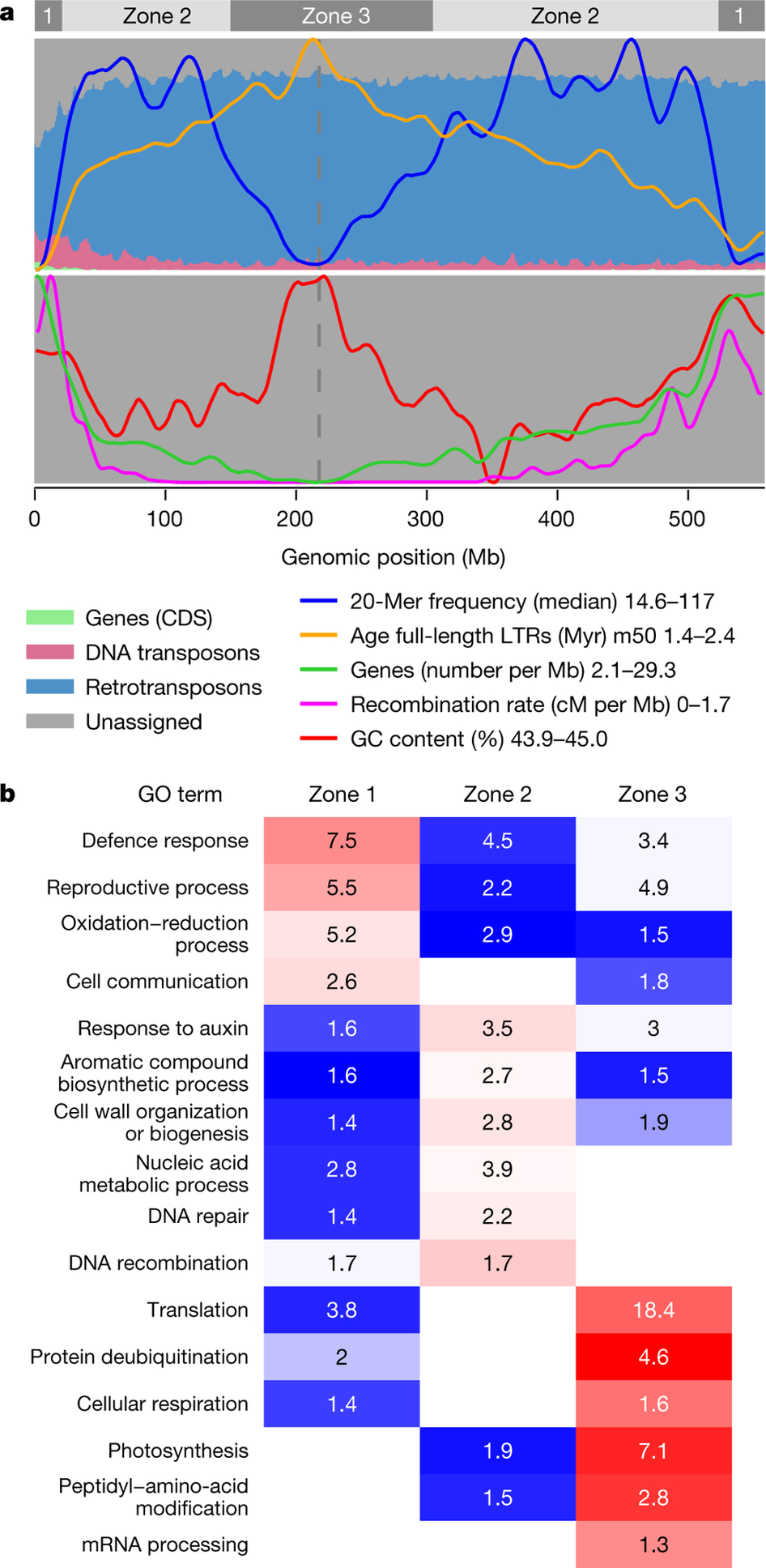 利用染色體位置信息,通過對20-mer頻率將染色體進(jìn)行劃分成了三種區(qū)域,每種區(qū)域上在基因密度,重組率,LTR插入時(shí)間以及GC含量上都存在一定的規(guī)律。