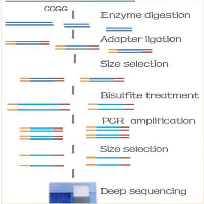 簡(jiǎn)化甲基化測(cè)序(Reduced representation bisulfite sequencing,RRBS)主要針對(duì)CpG富集的區(qū)域的甲基化研究方法,它依據(jù)限制性內(nèi)切酶酶切手段將DNA酶切成小片段,選取特定片段大小的序列進(jìn)行重亞硫酸鹽測(cè)序分析,旨在評(píng)估CpG甲基化水平。