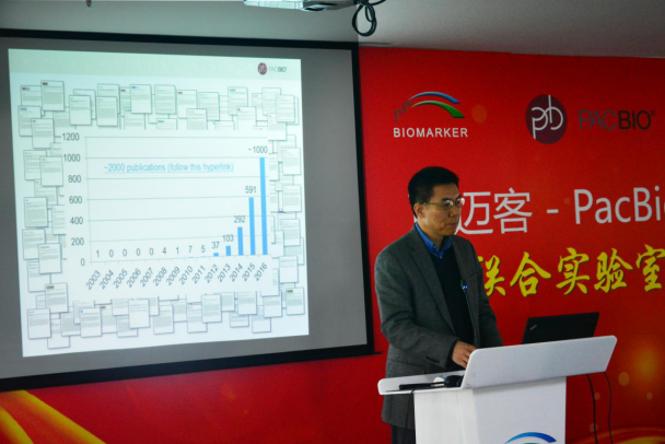 ? 接下來的學(xué)術(shù)交流環(huán)節(jié),PacBio公司亞太區(qū)市場(chǎng)部高級(jí)經(jīng)理錢祖衛(wèi)博士帶來了三代測(cè)序技術(shù)應(yīng)用的精彩分享,百邁客基因組高級(jí)技術(shù)總監(jiān)紀(jì)長(zhǎng)綿分享了百邁客 公司與浙江大學(xué)借助三代測(cè)序等技術(shù)在Nature Genetics上發(fā)表的芥菜基因組文章,百邁客云市場(chǎng)部經(jīng)理孫瑛女士為大家介紹了百邁客云。儀式最后階段,基因組測(cè)序研發(fā)經(jīng)理?xiàng)罘珟ьI(lǐng)參會(huì)人員參觀了百 邁客的實(shí)驗(yàn)室,講解了百邁客的發(fā)展歷程。