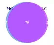 在細菌屬水平。共鑒定出75個屬水平細菌,在兩組間共有70個屬,在MC組有三個特有的屬,在LC水平有2個特有的屬,普氏菌屬(10.4-17.9%)在兩組間都為主要屬水平的菌。