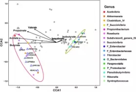 通過CCA相關(guān)性分析發(fā)現(xiàn),顯著上調(diào)的GPRs和HDACs與8個顯著增加的微生物屬(56個 OTUS)是呈正相關(guān),顯著下調(diào)的GPRs和HDACs和9個顯著減少的細菌屬呈正相關(guān)(63個OTU),然而HDAC1與丁酸鹽的比例呈負相關(guān)。