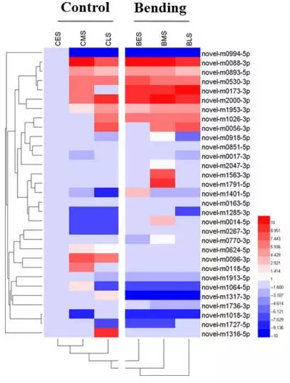 對嫩枝彎曲處理組和對照組間的31個差異表達新miRNA進行表達層次聚類分析。結(jié)果顯示,根據(jù)表達模式可分為5個亞簇。其中Cluster 1中的6個新miRNA在嫩枝彎曲組表達量均高于對照組。Cluster 5中的新miRNA表達模式則與Cluster 1中相反。其他三簇中的19個新miRNA,無論在對照組還是嫩枝彎曲處理組,展現(xiàn)出較低的表達水平。