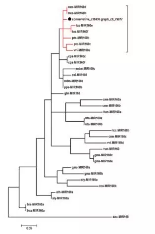 將成熟的miRNA比對(duì)到植物的ncRNA Database鑒定到19個(gè)miRNA。以MIR160家族為例進(jìn)行系統(tǒng)進(jìn)化分析:基于pre-miRNA序列來(lái)構(gòu)建MIR160家族系統(tǒng)進(jìn)化樹(shù)。結(jié)果顯示保守的c38436.graph_c0_79977與來(lái)自葡萄、楊樹(shù)、木薯和蓮花的MIR160形成了一個(gè)分枝,這也與山茶花的進(jìn)化地位相一致。