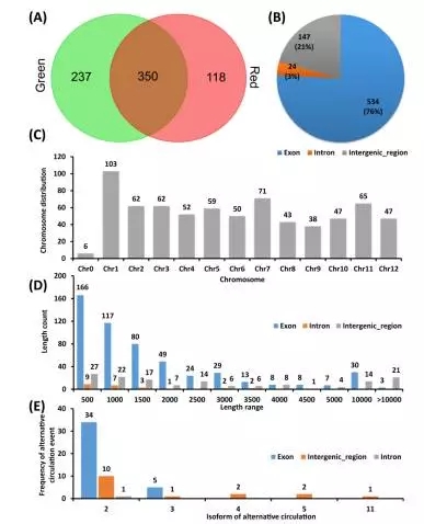 (A):共表達和特異表達分析;(B):來源分析;(C):染色體分布分析;(D):長度分析;(E):可變剪切分析。