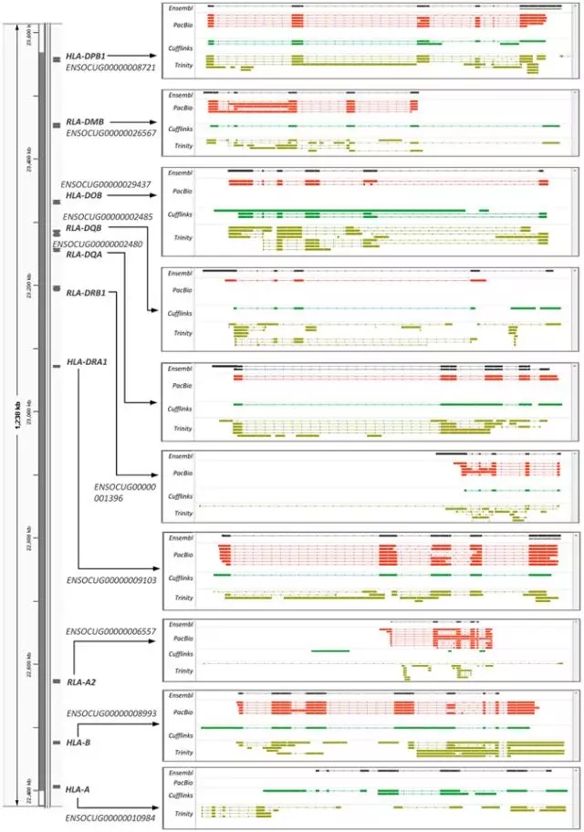 Figure 4.基因通過PacBio所測(cè)轉(zhuǎn)錄本和組裝得到的轉(zhuǎn)錄本還原10個(gè)MHC基因。染色體定位、命名和每個(gè)基因的Ensembl編號(hào)(在左側(cè))。