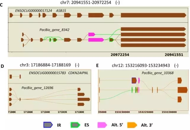 Figure 2. 三代測(cè)得轉(zhuǎn)錄本的不同isoforms,在數(shù)據(jù)庫(kù)中的參考基因模型如圖示中被標(biāo)記有染色體位置、基因ID和基因名稱