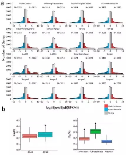 由于芥菜基因組是異源四倍體,也就是說(shuō)基因組中存在兩套非常相似的亞基因組,那么在基因表達(dá)的過(guò)程中,位于兩套亞基因組上的等位基因的表達(dá)模式是怎么樣的呢,是一起表達(dá),是相互抑制,還是一方占主導(dǎo)?