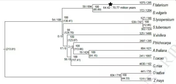 苦蕎與擬南芥、可可、大豆、葡萄、楊樹、馬鈴薯、番茄以及單子葉的水稻和玉米構建系統(tǒng)發(fā)育進化樹,見下圖。此外還進行基因家族聚類分析,找出共同和特有的基因家族。