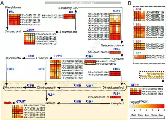 蘆丁的生物合成具有特殊的意義,而苦蕎被認為是這種有益的類黃酮的主要食物來源。苦干蕎麥營養(yǎng)生物質(zhì)中含有3%的蘆丁。通過比較基因組以及不同生長部位的轉錄組測序,發(fā)現(xiàn)原來所不知道的全長蛋白CHI(FtPinG0002790600)和f3h(FtPinG0006662600)。