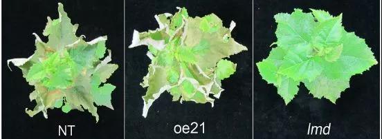 作者在研究BpGH3.5在樺樹中的功能時偶然獲得了lmd突變體。構(gòu)建的21株OE-GH3.5株系中,唯獨lmd葉片表現(xiàn)出壞死斑點并伴有早衰的現(xiàn)象。這很明顯是一種病變的表現(xiàn),當(dāng)這種情況出現(xiàn),很顯然我們要思考兩個問題: