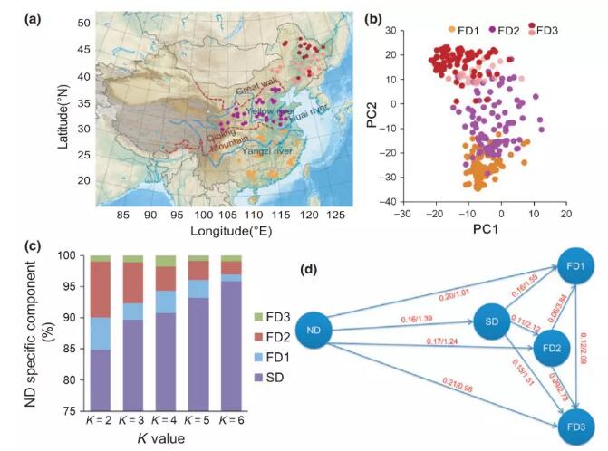 (2)通過(guò)基因滲透和PCA分析推出半馴化品種是一種進(jìn)化上的中間產(chǎn)物,而不是馴化品種和野生大豆雜交產(chǎn)生的,此外,三群體檢測(cè)的結(jié)果也進(jìn)一步論證了這一點(diǎn),同時(shí),論證出栽培大豆是從中部黃淮海地區(qū)向北向南馴化,進(jìn)而將中國(guó)馴化大豆起源√確的定位到中國(guó)中部黃淮海區(qū)域。