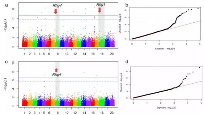 (2)通過(guò)全基因組關(guān)聯(lián)分析找到19個(gè)與胞囊線蟲(chóng)抗性相關(guān)的位點(diǎn),其中8個(gè)位點(diǎn)與之前報(bào)道過(guò)的QTL位點(diǎn)重合,8個(gè)位點(diǎn)與已經(jīng)報(bào)道的抗胞囊線蟲(chóng)基因Rhg4及Rhg1連鎖,并鑒定出3個(gè)新的QTL位點(diǎn)。通過(guò)基因注釋獲得到與抗病,細(xì)胞色素P450,蛋白激酶等相關(guān)的功能基因。