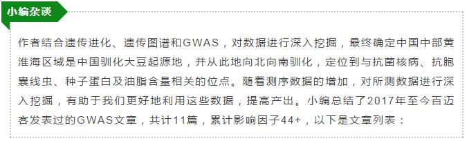 大豆作為重要的農(nóng)作物,在我國(guó)有著6000-9000年的馴化史,其馴化方向主要與產(chǎn)量、品質(zhì)和抗病等性狀相關(guān)。東北農(nóng)業(yè)大學(xué)的李文濱教授及其團(tuán)隊(duì)和北京百邁客生物科技有限公司合作,在大豆起源、抗菌核病、抗胞囊線蟲(chóng)、種子蛋白及油脂含量方面取得重要進(jìn)展,其研究成果相繼發(fā)表在New Phytologist、The Plant Journal、BMC Genomics和Genomics,累計(jì)影響因子23+。下面我們就看看作者是如何對(duì)數(shù)據(jù)進(jìn)行深入挖掘,做到低投入、高產(chǎn)出的。