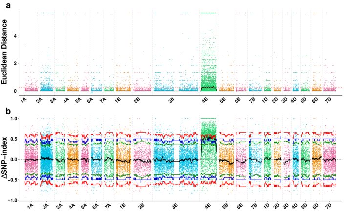 利用SNP-index和ED兩種算法,將抗病基因YrR39定位在4B染色體上17.39 Mb的區(qū)域內(nèi)。(這里就不細(xì)說了,直接上圖)