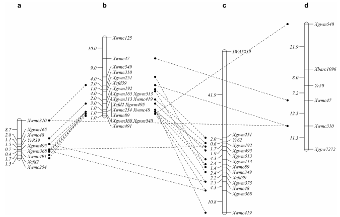 4B染色體上有83對(duì)SSR是有多態(tài)性的,但是其中只有8對(duì)能清楚的區(qū)分雙親及兩個(gè)混池。利用其對(duì)462個(gè)F2個(gè)體進(jìn)行基因分型并構(gòu)建遺傳圖譜,將YrR39定位于染色體4BL 的2.6cM的區(qū)間內(nèi),其側(cè)翼標(biāo)記為Xwmc495和Xwmc48(如圖3)。這與BSA分析結(jié)果一致,也驗(yàn)證了SLAF-seq檢測(cè)結(jié)果的準(zhǔn)確性。