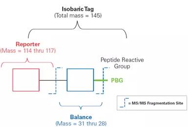 iTRAQ試劑由三部分組成:報告基團;質(zhì)量平衡基團和肽反應(yīng)標(biāo)記試劑基團,可形成4種或8種相對分子質(zhì)量均為145的等量異位標(biāo)簽。